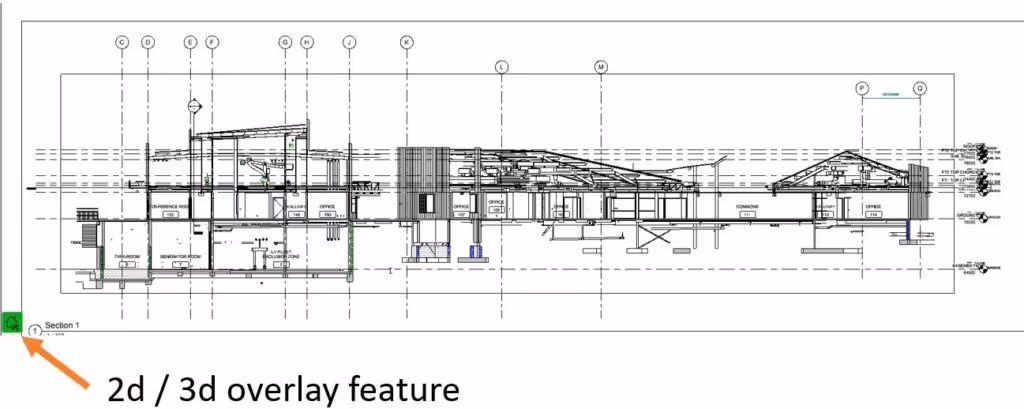 Durch die direkte Verwendung der 2D-Schnittansicht, bei der der Schnitt durch das Gebäude in 3D geschnitten wird, erhalten die Benutzer die Perspektive des dahinter liegenden Bereichs. Das Gleiche gilt für eine Draufsicht, bei der die Überlagerung angewendet wird und dann der Schnitt angepasst wird, um den Modellschnitt in der Ansicht nach oben oder unten zu bringen. Um eine weitere Kontextebene hinzuzufügen, kann Revizto auch das Blatt abtrennen, um das Modell durch die angezeigte Linienarbeit zu bringen.