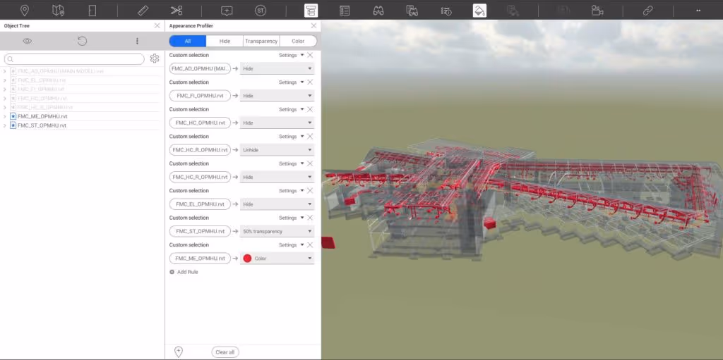 Die Flexibilität bei der Erstellung von Ansichten ist auch bei der 3D-Umgebung von Revizto zu erwähnen. Ob Objekte ausgewählt werden, um einen Kastenquerschnitt zu erzeugen, oder ob eine gesamte Verbindung transparent gemacht wird, um bei einer Diskussion über ein mechanisches System hinter die Wände zu schauen. All diese Einstellungen lassen sich in eine Ansichts- oder Darstellungsvorlage einbinden – die Möglichkeiten sind endlos.