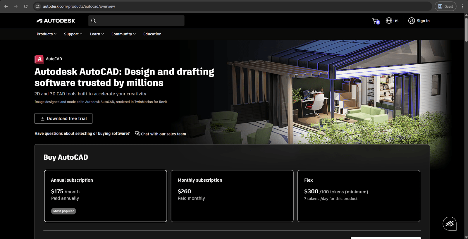 AutoCAD Architecture | Cabinets d’architecture professionnels, entreprises de conception-construction, établissements d’enseignement exigeant des livrables CAO traditionnels avec intelligence architecturale | 260 $/mois, 2 095 $/an ou 6 285 $/3 ans ; Autodesk Flex : 7 jetons/jour |