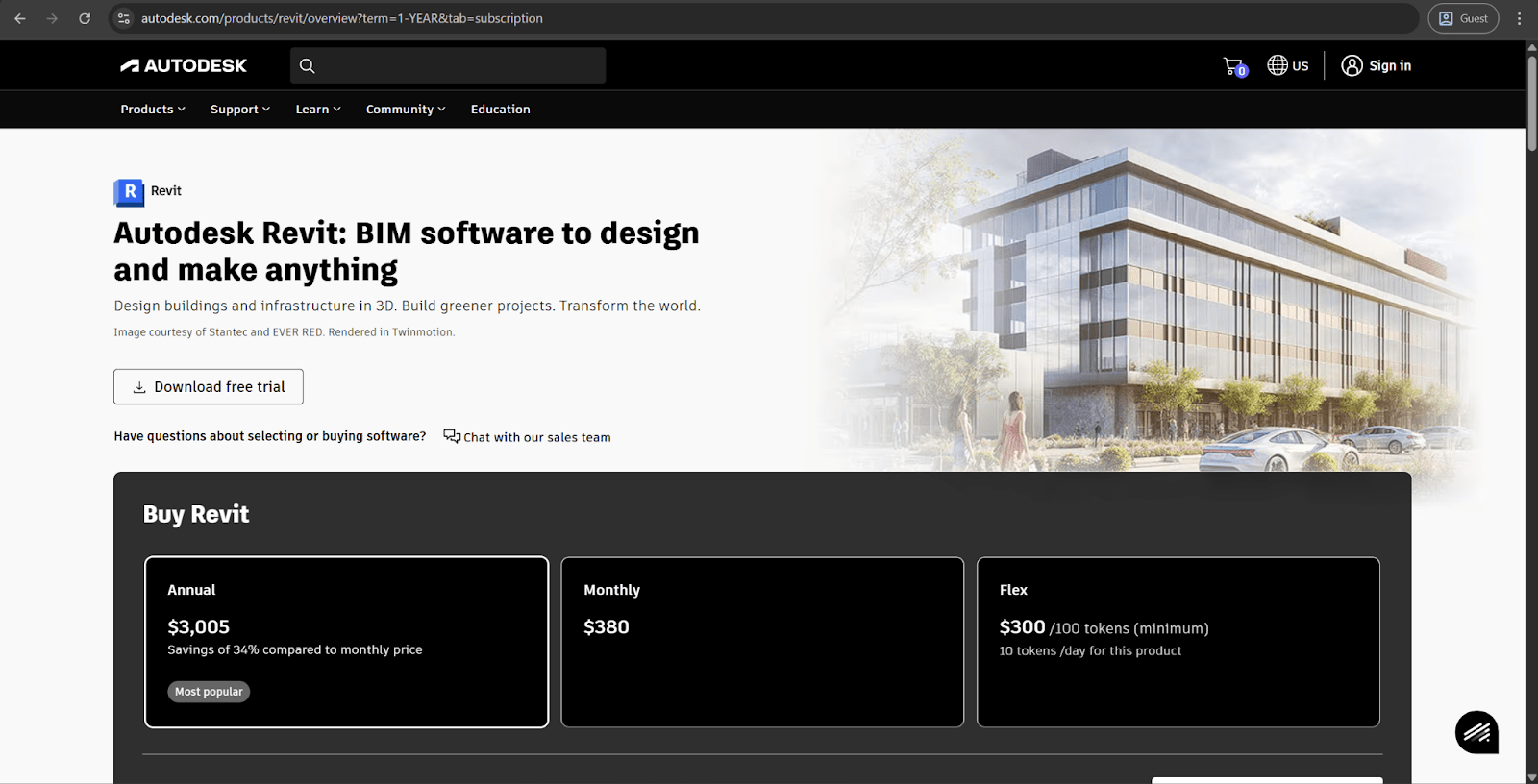 Revit | Grandes équipes pluridisciplinaires, projets commerciaux complexes, coordination BIM complète entre les disciplines architecturales/structurelles/MEP | 380 $/mois, 3 005 $/an, ou 9 020 $/3 ans ; Autodesk Flex : 10 jetons/jour |