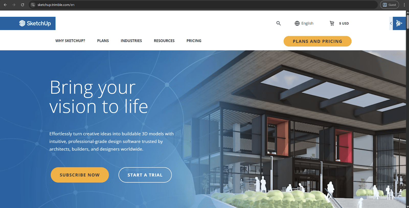 SketchUp | Conception, visualisation rapide, utilisation pédagogique, petits cabinets d’architectes, bricoleurs | Version gratuite disponible ; Go : $129/an, Pro : $399/an, Studio : 819 $/an |